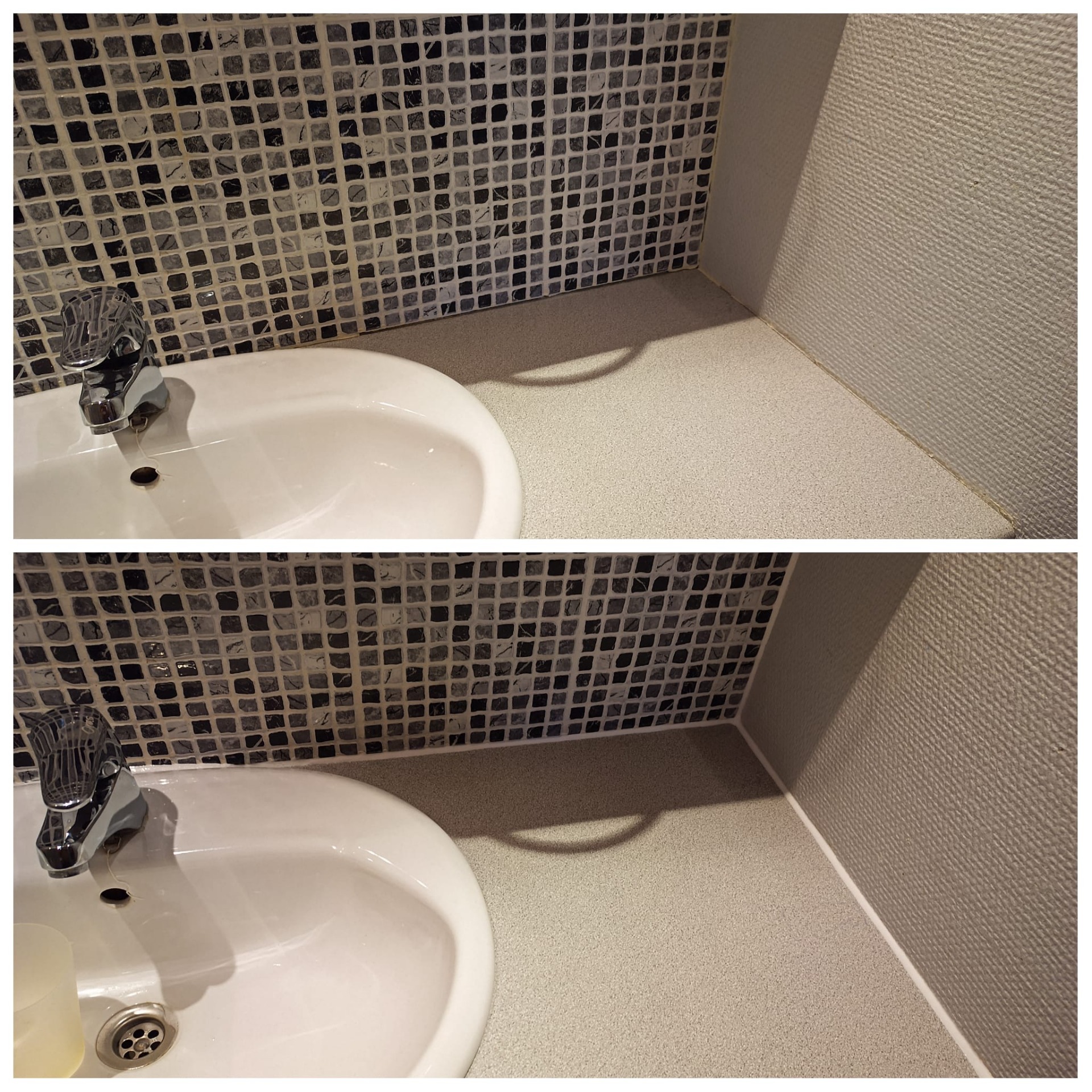 Kuvassa asiakaskohteeseen tehty silikonisaumojen uusiminen wc-tiloihin.